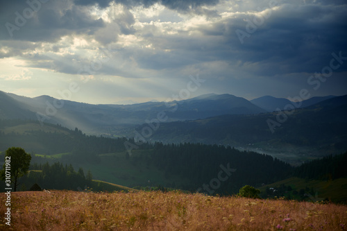 Sunset in carpathian mountains - beautiful summer landscape, spruces on hills, dark cloudy sky and bright sun light, meadow and wildflowers
