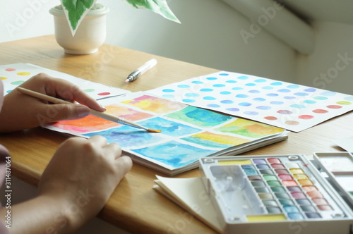 Watercolor paints and brushes workplace artist with artistic tools for mock up.Creative Design Concept.