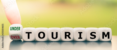 Hand turns a dice and changes the expression "over tourism" to "under tourism".
