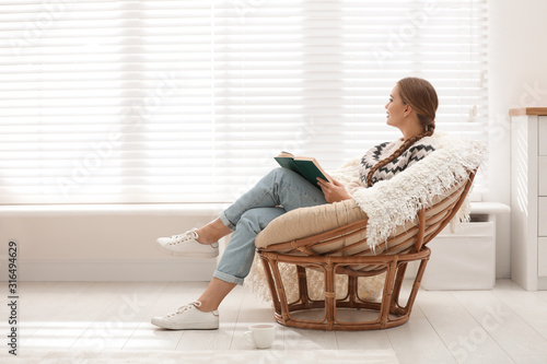 Young woman reading book in papasan chair near window at home