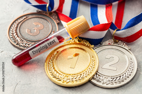 Doping test. Gold, silver and bronze medal and test tube with blood on a gray background