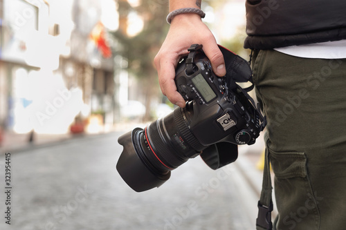 Young photographer taking photos on the streets of the city