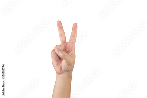 Asian hand shows and counts 2 finger on isolated white background with clipping path