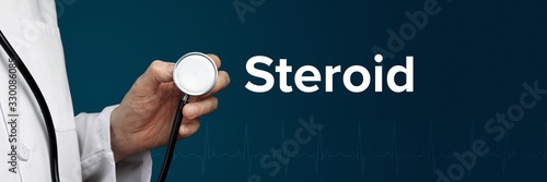 Steroid. Arzt im Kittel hält Stethoskop. Das Wort Steroid steht daneben. Symbol für Medizin, Krankheit, Gesundheit