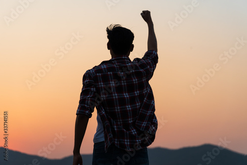 Man with fist in the air during sunset sunrise mountain in background. Stand strong. Feeling motivated, freedom, strength and courage concept.