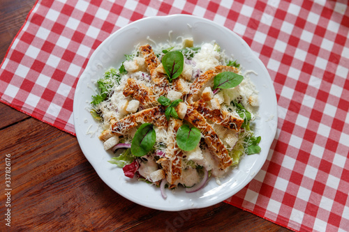 Sałatka Cezar na białym talerzu stojąca na drewnianym stole