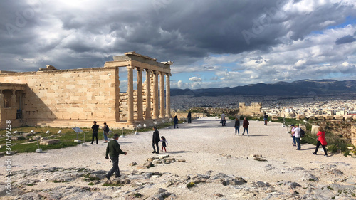 Athens, Greece - March 14, 2018: Erechtheion temple in Athens. Ruins of the Temple of Erechtheion and Temple of Athena at the Acropolis hill in Greece.