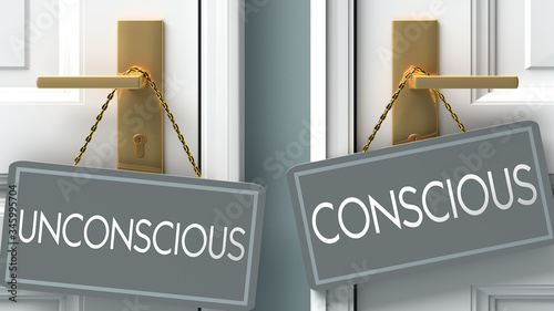 conscious or unconscious as a choice in life - pictured as words unconscious, conscious on doors to show that unconscious and conscious are different options to choose from, 3d illustration
