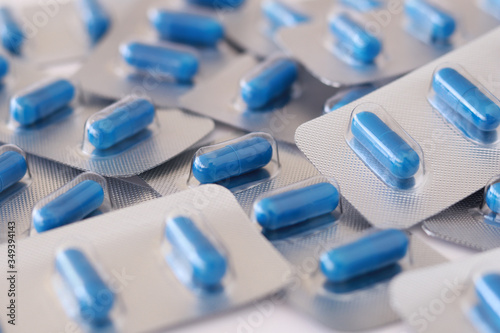 bunching of blue capsules still in packs