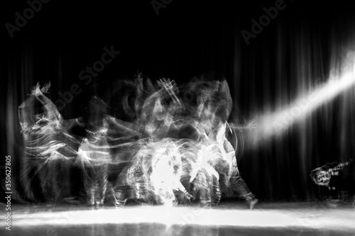 An artistic dancer in a theater shot with a slow shutter speed in order to achieve the desired motion blur.