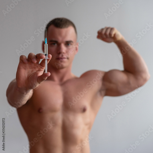 Attractive male bodybuilder with a naked torso holds a dope syringe. The athlete puts himself an injection of growth hormone.
