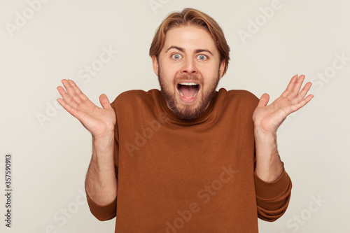 Oh my god, wow! Portrait of happy astonished excited bearded man standing with open mouth and screaming in sudden shock, surprised by unbelievable success. studio shot isolated on gray background