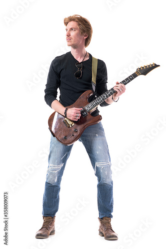 #4749742Serious confident rocker guitarist playing electric guitar with sunglasses on. Full body length isolated on white background.