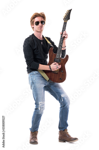 Serious confident rocker guitarist playing electric guitar with sunglasses on. Full body length isolated on white background.