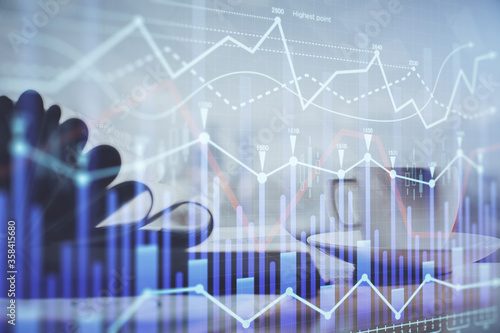 Double exposure of financial chart drawing and desktop with coffee and items on table background. Concept of forex market trading