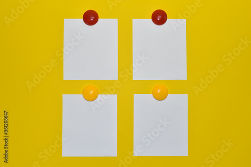 Białe kartki z kolorowymi magnesami.