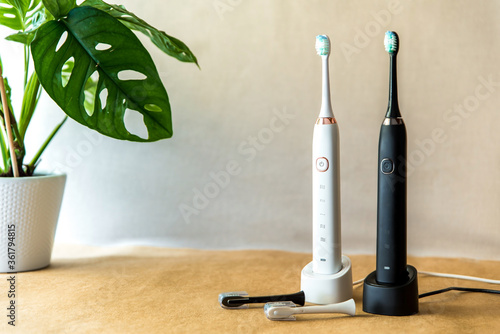 Modern black and white sonic or electric whitening toothbrush set. Concept of professional oral care and healthy teeth by using sonic smart toothbrush
