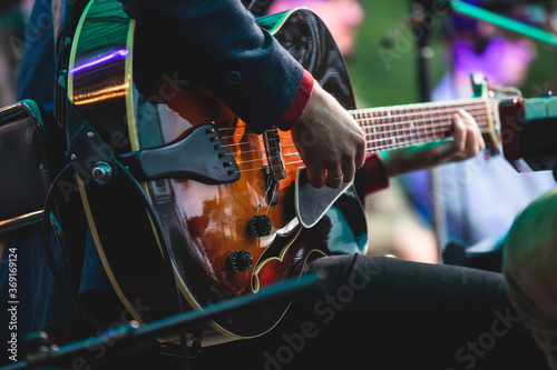 Concert view of an electric acoustic guitar player with vocalist and musical jazz band orchestra performing in the background, guitarist on the stage