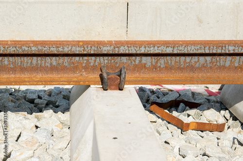 Zardzewiały tor, szyna tramwajowa.