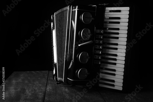 Old accordion on rustic wooden surface with black background and Low key lighting, selective focus.