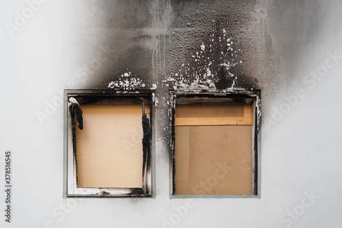 house or home fire - boarded up windows and burned facade blackened by soot of modern apartment building