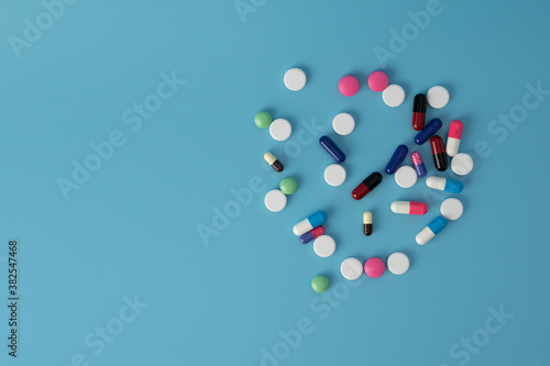 medicine pills on blue background Copy space for text Assorted pharmaceutical Healthy Eating, Lifestyle.