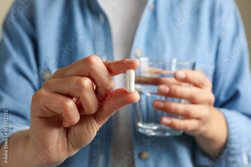 Woman hold glass of water and pill, close up