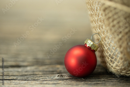 Dekoracja świąteczna z bliska, bombka na stole drewnianym.