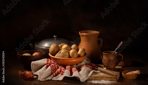 Still life with old ceramic and raw potato dishes