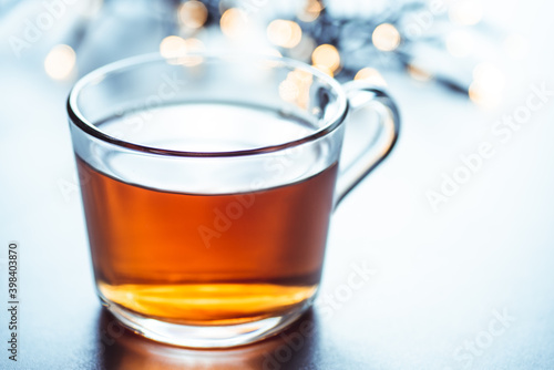 Glass cup of hot aromatic tea on white background with spices. Christmas tea with oranges on bokeh lights background. Christmas tea.