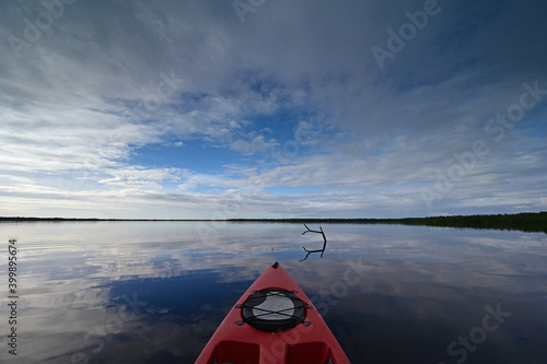 Red kayak on Coot Bay in Everglades National Park, Florida under winter cloudscape reflected in tranquil water,