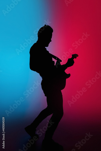 Action. Silhouette of young male guitarist isolated on blue-pink gradient studio background in neon. Beautiful shadow in action, performing. Concept of human emotions, expression, ad, music, art.