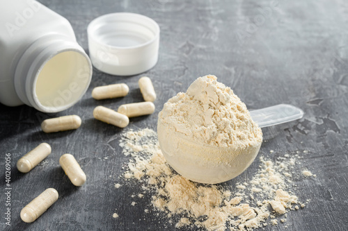 Scoop of whey or soy protein isolate, white capsules of bcaa, beta-alanine and taurine amino acids, creatine, bodybuilding food supplements on stone background