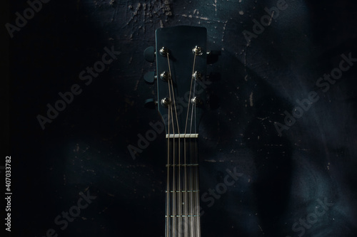 An acoustic guitar stands against the wall against a dark background. Learning to play a musical instrument. Background with space to copy
