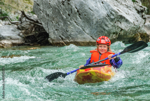Junges Mädchen steuert souverän ihr Kajak durch die verblockte Soca in Slowenien