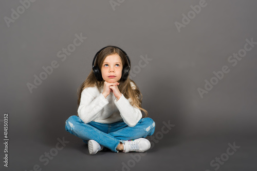 Cute child girl in headphones enjoying happy dance music, smile, posing on grey studio background.
