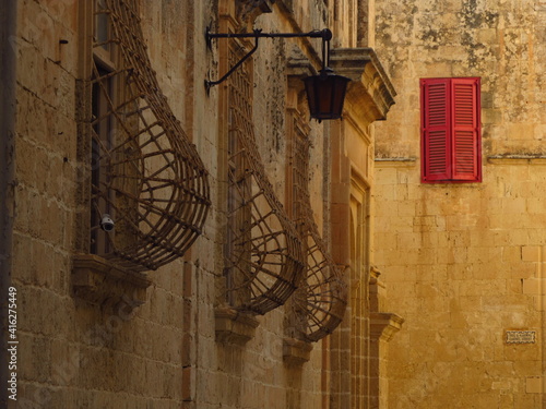 Czerwona okiennica w starym mieście ciszy na Malcie