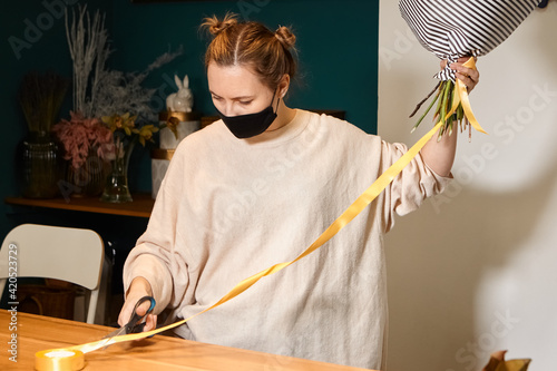 Florist works with colors. Flower seller chooses flowers for future bouquet. Flowers shop worker in a mask standing in flower shop and checking flowers in glass vase.
