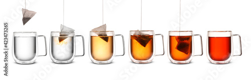 Process of making tea in glass cup on white background