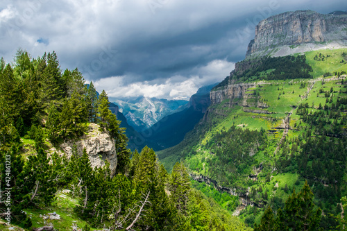 Valle de Ordesa, España, visto desde la Senda de los Cazadores, que discurre entre coníferas y sobre desplomes de roca caliza en uno de los parques nacionales más hermosos de los Pirineos, UNESCO