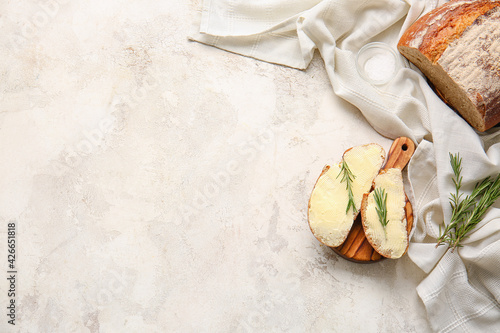 Slices of fresh bread with butter and rosemary on light background