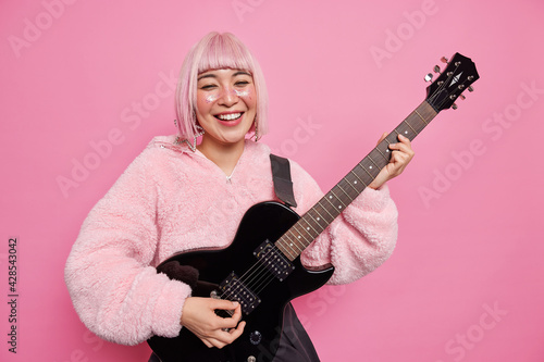 Positive famous rock girl plays electric acoustic guitar has fun feels awesome and crazy pretneds performing on stage wears fashionable clothes isolated over pink background. Famous rockstar