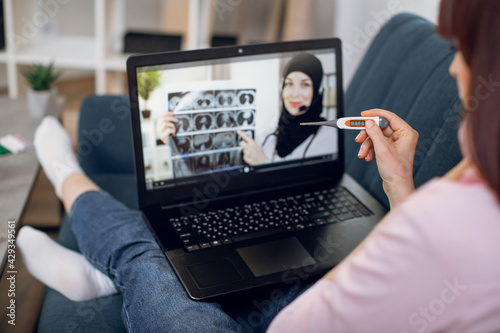 Back shoulder view of sick girl, sitting on couch at home and looking at thermometer and talking to his doctor on a video call. Laptop screen with muslim lady doctor, explaining results of x-ray scan.
