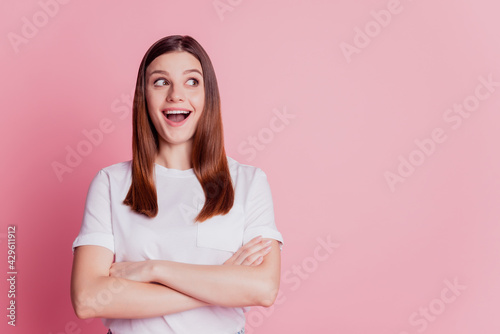 Closeup photo of attractive person look empty space open mouth amazed face on pink wall