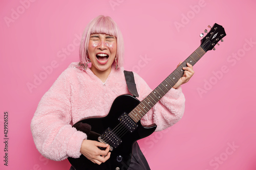 Music music intstruments and hard rock concept. Emotional hipster girl exclaims loudly keeps mouth opened plays black acoustic guitar wears fur coat isolated on pink background being talened musician