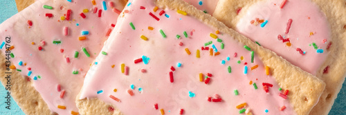 Pop tart panoramic header, a close-up of strawberry toaster pastry, American dessert