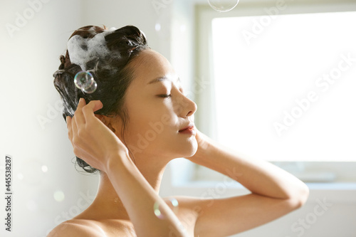バスルームで髪の毛のシャンプーをする若い女性