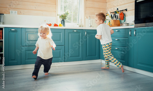 Children's entertainment in the house. Small children run around in the kitchen and play fun games together. Home clothes for the little ones.