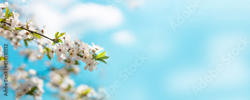 Closeup of blooming cherry tree in spring on pastel bokeh background. Beautiful border banner. Abstract blurred background. Spring time