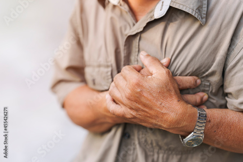 Close-up of an elderly man's hand held his chest in pain. Concept of heart disease.